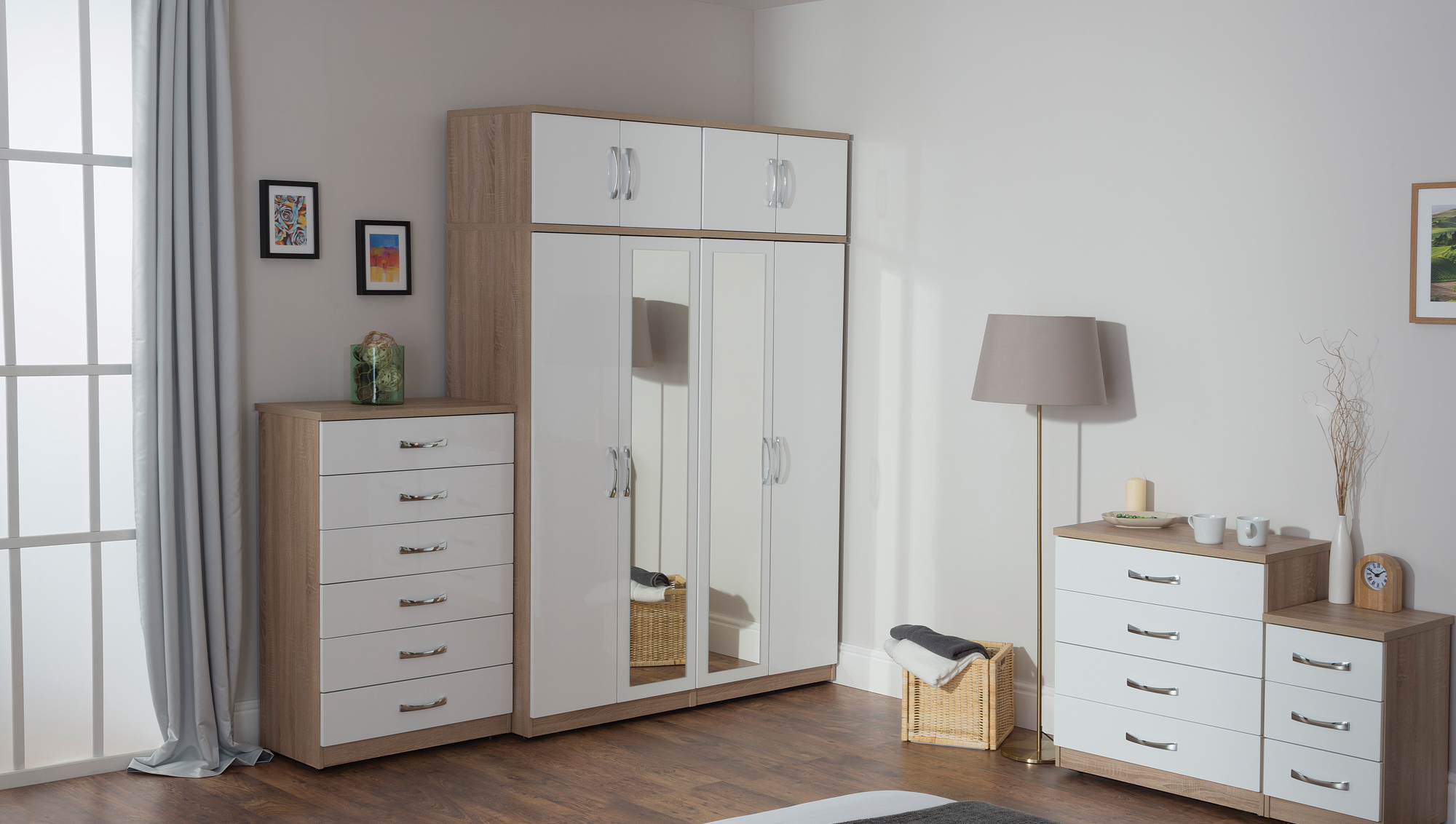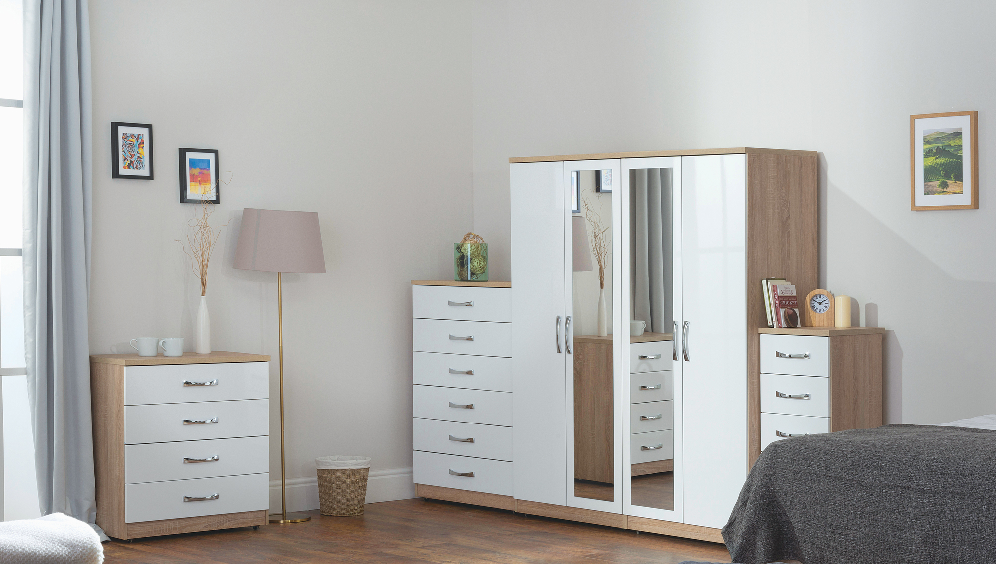 Rauch memphis 4 door combi wardrobe white carcase and white doors 181cm. $44.99 plan starts on the date of purchase. Mark harris high gloss dining furniture. Tvilum austin 2 drawer nightstand, oak structure/white high gloss. Burton clay and anthracite larch bedroom furniture. London white high gloss 2 drawer bedside chest. Get set for oak and white gloss wardrobes at argos. Julian bowen metro painted furniture. Add to compare add to cart. Sherwood oak 4 drawer bed box. Add to compare add to cart. Vida living calico high gloss & glass furniture. Choose the item you require then pick your colour from the drop down.